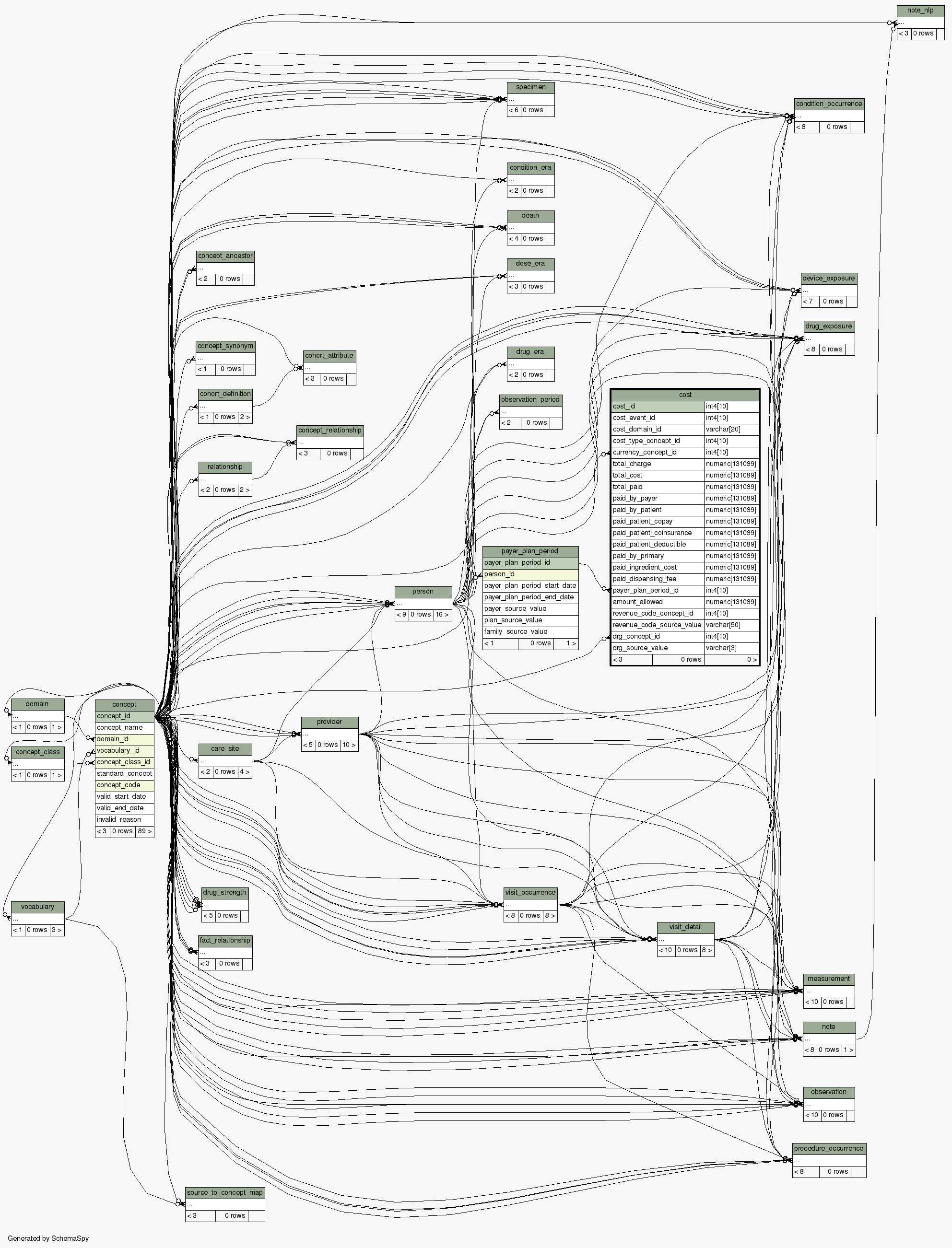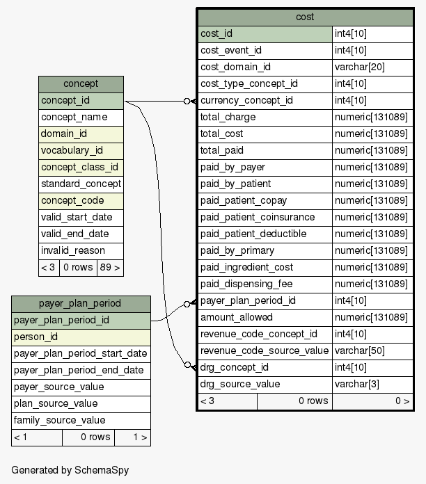 Table postgres.omop.cost [ECONOMIC] The COST table captures records containing the cost of any medical entity recorded in one of the DRUG_EXPOSURE, PROCEDURE_OCCURRENCE, VISIT_OCCURRENCE or DEVICE_OCCURRENCE tables. It replaces the corresponding DRUG_COST, PROCEDURE_COST, VISIT_COST or DEVICE_COST tables that were initially defined for the OMOP CDM V5. However, it also allows to capture cost information for records of the OBSERVATION and MEASUREMENT tables.
