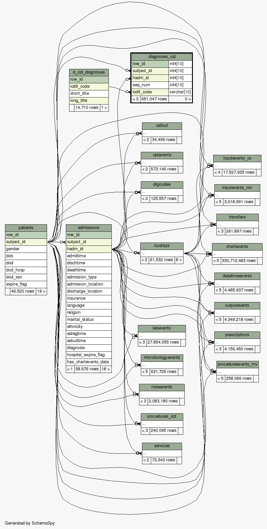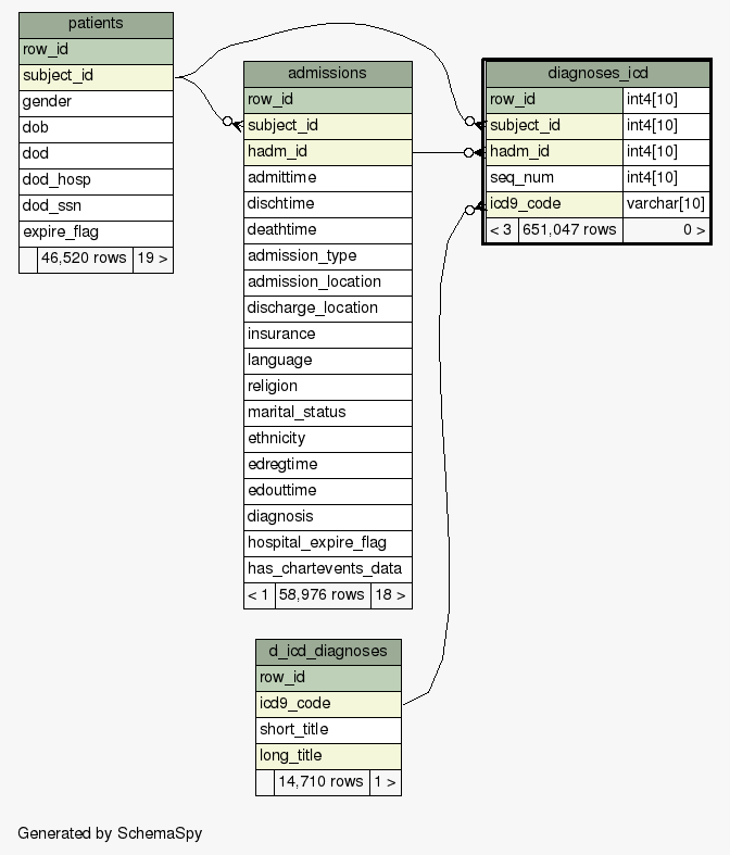 Table mimic.mimiciii.diagnoses_icd Diagnoses relating to a hospital admission coded using the ICD9 system.